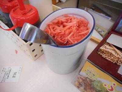 紅しょうがでした。しょうがを酢につけたもので、主に牛めしに添えて食べることが多いです。