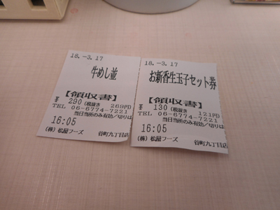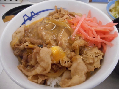 牛めし(並)290円とお新香生玉子セット130円の合計420円となります。牛めしは、ミニ盛から特盛まで4つのサイズがあります。